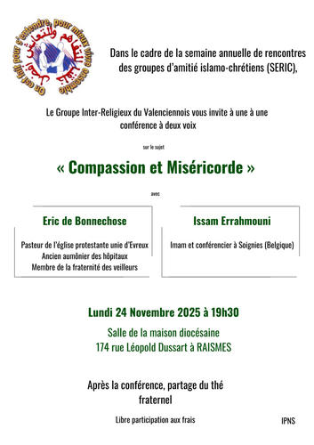 Dans le cadre de la semaine annuelle de rencontres des groupes d'amitié islamo-chrétiens (SERIC), le Groupe Inter-Religieux du Valenciennois vous invite à une conférence à deux voix sur le sujet :